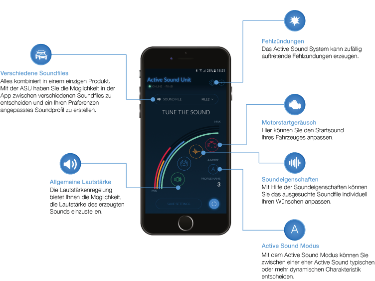 Der Motorsound von Ihrem Fahrzeug kann nach der Nachrüstung unkompliziert per App Steuerung oder original-verbauten Schaltern eingestellt werden. Mit der App sind folgende Funktionalitäten gegeben: